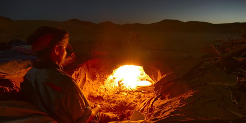 Anschliessend wechseln wir in die sanfte Welt des Sandes und wandern von einem Erg (Sandmeer) zum nächsten. Wie die Wellen des Meeres erstrecken sich die Dünen vor uns, eine nach der anderen. Wenn wir die Augen etwas zukneifen, lassen uns gerippte Oberflächen träumen vom Fliegen über eine Phantasiewelt. Sterne funkeln nachts am Himmel. Wir bewundern die Lebenskraft von Gräsern, Sträuchern und Eidechsen, die den harten Bedingungen in der Wüste trotzen.
